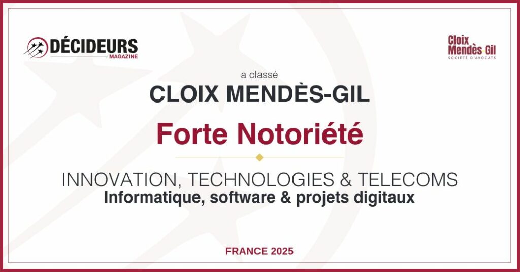 Le cabinet Cloix Mendès-Gil est heureux d'annoncer sa distinction dans le classement 2025 du guide Décideurs Juridiques : Innovation, Technologies et Télécoms, en tant que cabinet à Forte Notoriété dans la catégorie Informatique, software et projets digitaux.